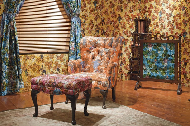 Dutch wax printed cotton textiles, reproduction furniture, fire screen, carpet and props